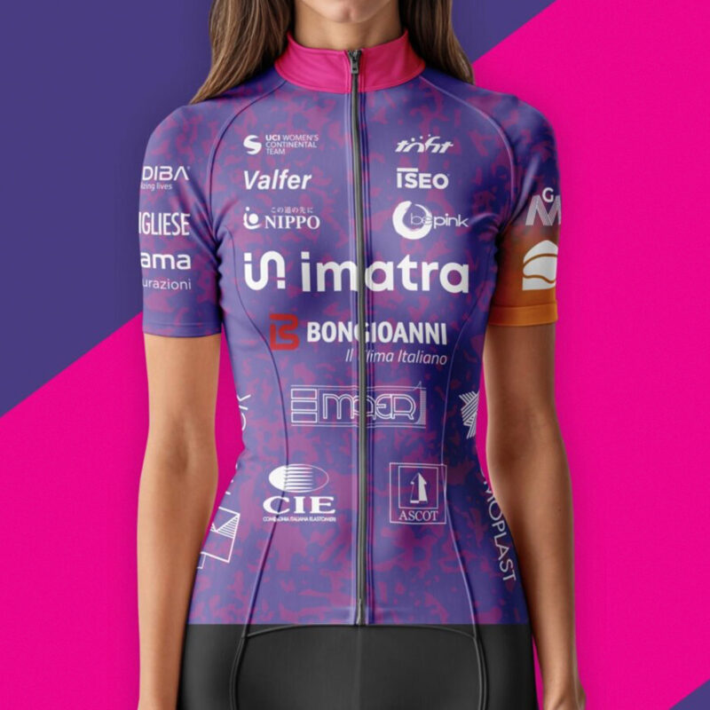 La maglia, sempre realizzata da To Fit (azienda italiana specializzata nella produzione di abbigliamento tecnico sportivo per ciclismo, triathlon e atletica) ricalcherà il modello del 2024, riproponendo una texture che, con stile ed eleganza, va a fondere i colori-simbolo della triade che, adesso, rappresenta il team: il magenta di BePink, il viola distintivo di Imatra e il rosso di Bongioanni.