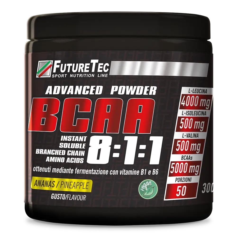 BCAA 8:1:1 ad alta solubilità con vitamine B1 e B6, per energia, recupero e supporto muscolare, 100% vegan.