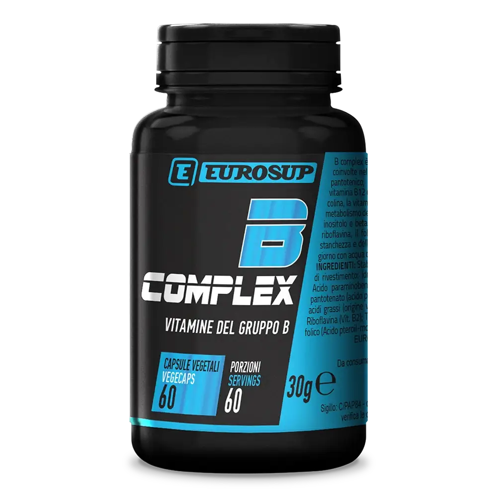 B complex è un integratore alimentare di vitamine del gruppo B, la sua formula completa fornisce tutte le vitamine del gruppo B. Contiene inoltre PABA (acido para-aminobenzoico), Betaina, Colina e inositolo: questi nutrienti incrementano l’efficacia del prodotto.