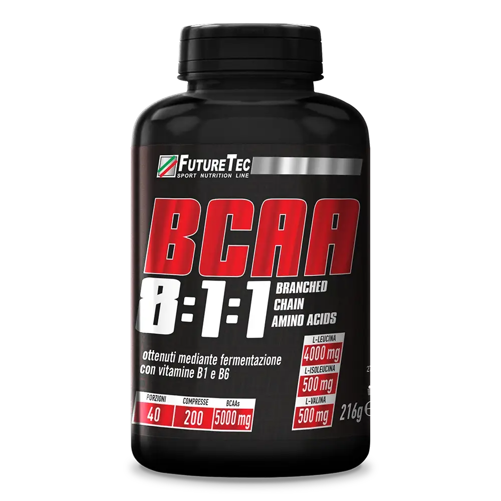 BCAA 8:1:1 è un integratore in compresse con alto contenuto di L-Leucina, vitamine B1 e B6, ideale per supporto muscolare ed energetico, adatto ai vegani.