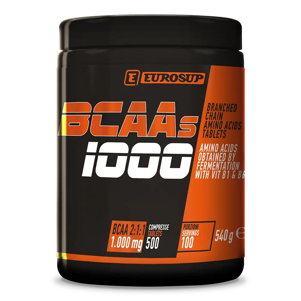 BCAA 1000 2:1:1 è un integratore alimentare di aminoacidi a catena ramificata ottenuti mediante fermentazione, con vitamine B1 e B6. I BCAA sono aminoacidi essenziali, l’organismo infatti non è in grado di sintetizzarli e devono pertanto essere assunti attraverso la dieta. BCAA 1000 2:1:1 è realizzato in compresse da 1000 mg nel classico rapporto 2:1:1 (2 parti di L-Leucina, 1 di L-Valina e 1 di L-Isoleucina). Gli aminoacidi a catena ramificata sono un fondamentale supporto muscolare per gli sportivi. Se assunti prima degli allenamenti hanno funzioni principalmente energetiche ed anticataboliche, fungono da substrato energetico al fine di preservare la massa muscolare dal non essere disgregata a scopo energetico. Se assunti dopo gli allenamenti favoriscono la costruzione e il ripristino della massa magra. La formula infine comprende la vitamina B1 che supporta il normale metabolismo energetico e la vitamina B6 che contribuisce a ridurre stanchezza, affaticamento ed al sostegno del normale metabolismo delle proteine e del glicogeno. Non contiene ingredienti di origine animale ed è adatto anche ai vegani.