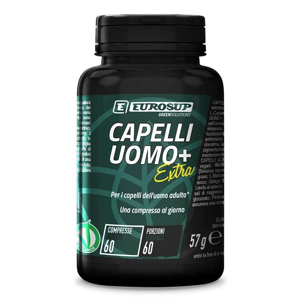 CAPELLI UOMO+ EXTRA è un integratore con Serenoa repens, aminoacidi solforati, estratti vegetali, vitamine e minerali, pensato per il benessere e il mantenimento dei capelli maschili.
