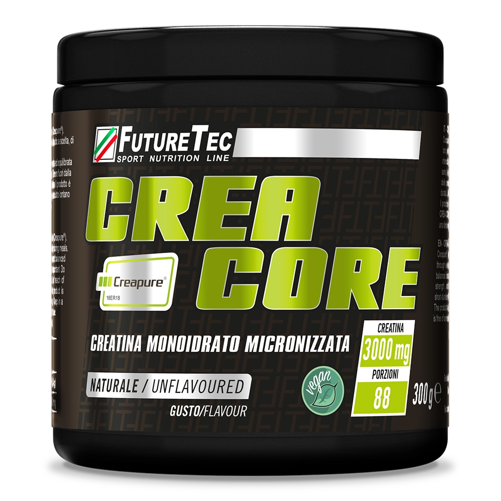 CREA CORE è creatina monoidrato Creapure® pura in polvere, ideale per aumentare forza e prestazioni fisiche.