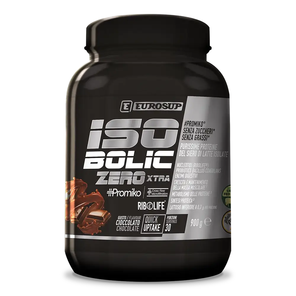 ISOBOLIC ZERO è un integratore alimentare di proteine del siero di latte isolate a solubilità istantanea con edulcorante, da ricostituire a bevanda. Per questo integratore Eurosup ha scelto l’isolato di proteine del siero di latte non denaturate #Promiko®, prodotto in Irlanda da Tirlán col metodo della microfiltrazione a flusso incrociato (CFM). Le proteine di ISOBOLIC ZERO sono realizzate a partire da latte di bovini allevati in Irlanda e alimentati ad erba. Le proteine del siero di latte isolate contenute in ISOBOLIC ZERO sono di elevatissima purezza: con l’innovativo sistema con tecnologia a membrana CFM, microfiltrazione a flusso incrociato, che opera a bassa temperatura, si ottengono purissime proteine non denaturate. Questo prodotto contiene solo aminoacidi essenziali e non essenziali naturalmente contenuti nelle proteine del siero di latte. Nessun aminoacido essenziale o non essenziale aggiunto in questa formula, l’apporto aminoacidico è quello naturale e quindi valore biologico delle proteine del siero di latte è garantito. Le proteine del siero di latte sono una fonte proteica ad alto valore biologico (valore biologico 104) ed hanno un alto contenuto di aminoacidi a catena ramificata. I tempi di digestione di queste proteine sono rapidi, quindi il rilascio degli aminoacidi contenuti è veloce. La formula di ISOBOLIC ZERO è stata sviluppata in modo specifico per gli sportivi. Le proteine contribuiscono alla crescita e al mantenimento della massa muscolare, la vitamina B6 contribuisce al normale metabolismo delle proteine e del glicogeno e alla riduzione della stanchezza e dell’affaticamento, lo zinco e il magnesio contribuiscono alla normale sintesi proteica, il folato contribuisce alla normale sintesi degli aminoacidi. ISOBOLIC ZERO è arricchito con enzimi digestivi: lattasi, proteasi, beta-D galattosidasi, lipasi, cellulasi. Le proteasi accelerano il processo di digestione delle proteine, mentre le lattasi intervengono nella digestione del lattosio contenuto nel prodotto, che pur essendo inferiore a 0,3 g a porzione potrebbe creare disturbi a chi ha forte intolleranza al lattosio. ISOBOLIC ZERO apporta inoltre nucleotidi (RIBOLIFE®) e Bacillus coagulans, un probiotico che favorisce l’equilibrio della flora intestinale. Bacillus coagulans è noto anche come Lactobacillus Sporogenes per la sua capacità di produrre spore e rimane inattivo fino alla colonizzazione intestinale, dove favorisce l’equilibrio dell’ecosistema intestinale, aumenta la digestione e l’assorbimento delle proteine e supporta il sistema immunitario. I nucleotidi sono le sub-unità che costituiscono gli acidi nucleici – DNA e RNA. Oltre ad essere precursori degli acidi nucleici, i nucleotidi fungono da trasportatori di energia a livello cellulare e possono fare parte della struttura di alcuni cofattori enzimatici e intermedi metabolici. I nucleotidi influiscono positivamente sui livelli di immunoglobuline salivari (IgA) negli atleti, possono ridurre i processi infiammatori indotti dall’attività fisica intensa, supportare il recupero dopo la performance e aumentare la resistenza durante l’esercizio prolungato. ISOBOLIC ZERO è indicato per i vegetariani ed è senza glutine.