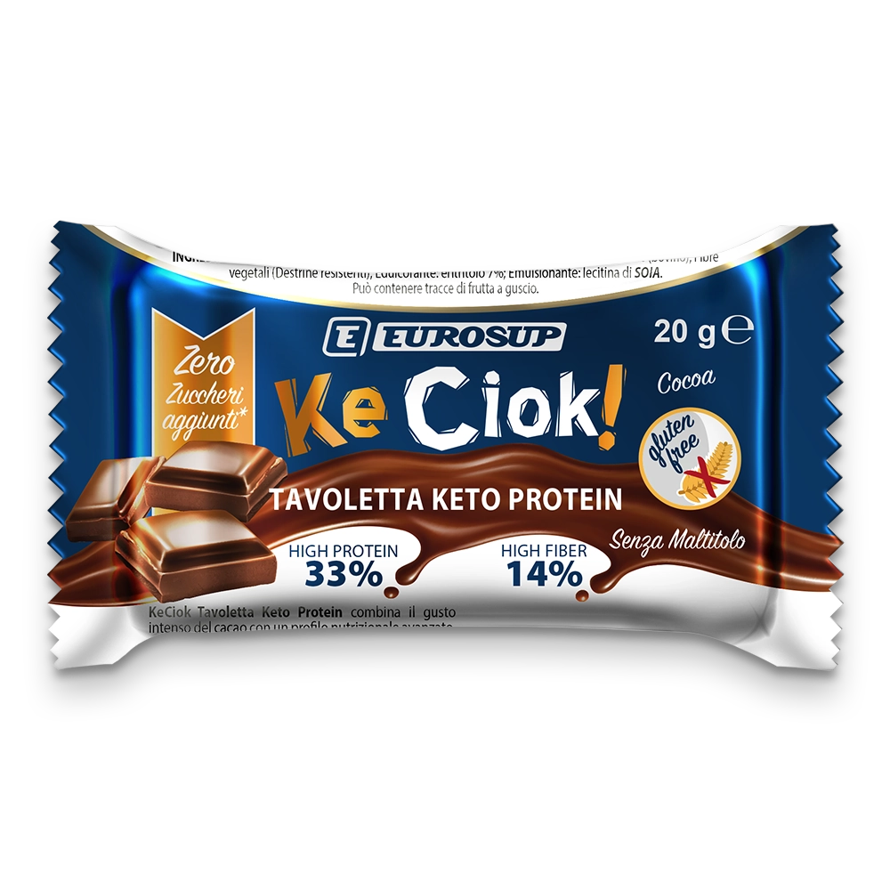 KeCiok Tavoletta Keto Protein combina il gusto intenso del cacao con un profilo nutrizionale avanzato, ideale per chi cerca uno snack sano e gustoso. Realizzata con proteine del latte ad alto valore biologico e collagene idrolizzato, il collagene riduce le rughe, rende la pelle più soda, levigata e idratata, e favorisce la formazione dei tessuti connettivi. Fornisce un elevato apporto proteico pari al 33%, contribuendo alla crescita e al mantenimento della massa muscolare. Ricca di fibre (14%) e senza zuccheri aggiunti*, è naturalmente dolcificata con eritritolo, un poliolo a zero calorie ben tollerato. Ha ridotto apporto di carboidrati ed elevato potere saziante, il che lo rende ottimo per colazioni e merende proteiche, diete keto, diete proteiche e ipoglucidiche. KeCiok è senza zuccheri aggiunti e senza glutine. Non contiene maltitolo né frutto-oligosaccaridi (FOS), gluco-oligosaccaridi (GOS) o inulina, che in alcune persone possono causare fastidi intestinali come la formazione di gas. L’unico poliolo presente è l’eritritolo, un dolcificante naturale a zero calorie. Perfetta come snack proteico durante la giornata o come merenda pre/post allenamento, è la scelta ideale per chi segue uno stile di vita attivo. Una dieta varia ed equilibrata, associata a uno stile di vita sano, è fondamentale per il benessere generale. Con edulcoranti.