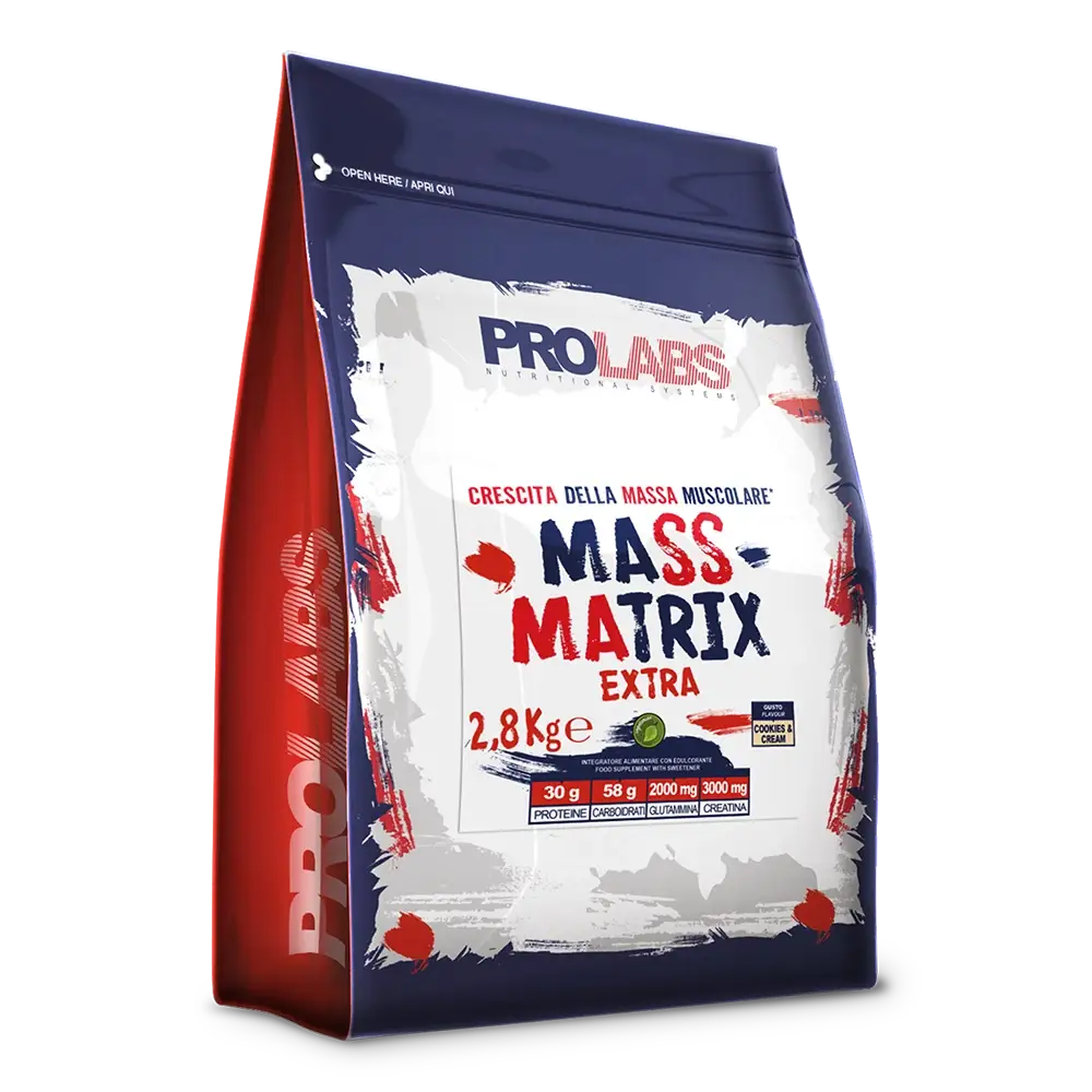 MASS MATRIX EXTRA è un integratore alimentare sviluppato appositamente per chi pratica Body Building e formulato per favorire l’incremento di massa e peso corporeo. Fornisce proteine con tempi di rilascio differenziati: caseine micellari, proteine del siero di latte, proteine del siero di latte isolate, proteine del siero di latte idrolizzate. Le proteine favoriscono la crescita della massa muscolare. MASS MATRIX EXTRA è formulato con maltodestrine, amido di mais ceroso e destrine cicliche altamente ramificate, carboidrati complessi ad assorbimento graduale e a rilascio differenziato di energia ai muscoli. La glutammina favorisce il recupero e la rigenerazione muscolare. La creatina incrementa le prestazioni fisiche in caso di attività ripetitive, di elevata intensità e di breve durata. L’effetto benefico si ottiene con l’assunzione giornaliera di 3 g di creatina. La vitamina B6 contribuisce al normale metabolismo energetico, al normale metabolismo delle proteine e del glicogeno e alla riduzione di stanchezza ed affaticamento.