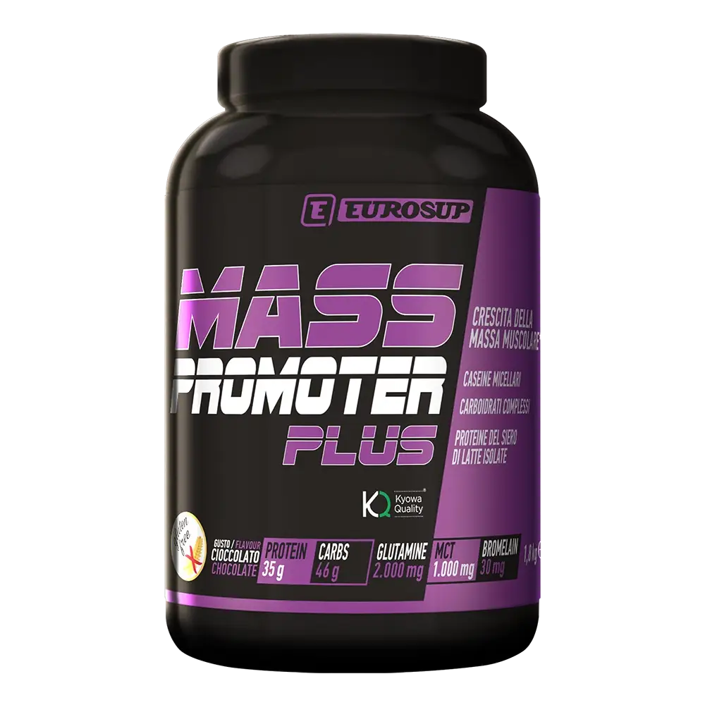 MASS PROMOTER PLUS è un Integratore alimentare con edulcorante per sportivi, sviluppato appositamente per chi pratica Body Building e formulato per favorire l’incremento di massa e peso corporeo. Fornisce proteine con tempi di rilascio differenziati: caseine micellari e proteine del siero di latte isolate, favoriscono la crescita della massa muscolare. MASS PROMOTER PLUS è formulato con maltodestrine a basso DE, carboidrati polimerici complessi costituiti da catene di singole molecole di glucosio. La velocità di assorbimento nell’organismo delle maltodestrine dipende dalla lunghezza dei polimeri e quindi dalla DE (destrosio equivalenza). Più la DE è alta e minore sarà la lunghezza della catena corrispondendo in un rapido assorbimento. La destrosio equivalenza (DE) indica il contenuto in zuccheri della maltodestrina, la DE6 contiene massimo 6% di zuccheri. La glutammina Kyowa Quality favorisce il recupero e la rigenerazione muscolare. Gli MCT (trigliceridi a media catena) sono acidi grassi a catena media e vengono digeriti in modo diverso rispetto agli altri grassi. Invece di essere immagazzinati come scorte, il fegato li converte direttamente in corpi chetonici, disponibili come energia per le cellule. La Bromelina, enzima naturale contenuto nell’ananas con proprietà digestive, favorisce il rilascio degli aminoacidi contenuti nelle proteine. La vitamina B6 contribuisce al normale metabolismo energetico, al normale metabolismo delle proteine e del glicogeno e alla riduzione di stanchezza ed affaticamento. MASS PROMOTER PLUS è istantaneamente solubile ed ha un ottimo gusto, è senza glutine ed è adatto ai vegetariani.