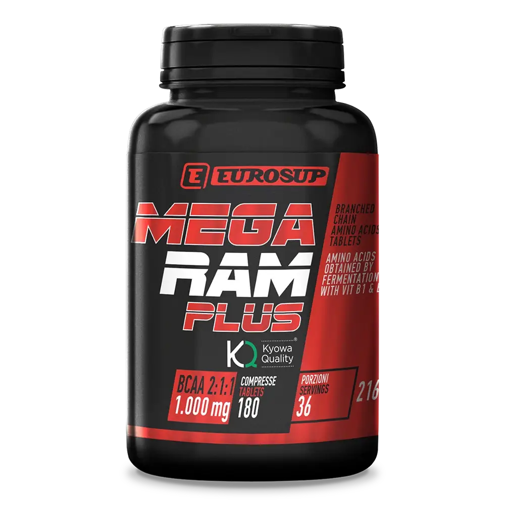 MEGA RAM PLUS è un integratore alimentare di aminoacidi a catena ramificata di qualità e purezza superiore garantita KYOWA QUALITY® ottenuti mediante fermentazione, con vitamine B1 e B6. I BCAA sono aminoacidi essenziali, l’organismo infatti non è in grado di sintetizzarli e devono pertanto essere assunti attraverso la dieta. BCAA 1000 2:1:1 è realizzato in compresse da 1000 mg nel classico rapporto 2:1:1 (2 parti di L-Leucina, 1 di L-Valina e 1 di L-Isoleucina). Gli aminoacidi a catena ramificata sono un fondamentale supporto muscolare per gli sportivi. Se assunti prima degli allenamenti hanno funzioni principalmente energetiche ed anticataboliche, fungono da substrato energetico al fine di preservare la massa muscolare dal non essere disgregata a scopo energetico. Se assunti dopo gli allenamenti favoriscono la costruzione e il ripristino della massa magra. La formula infine comprende la vitamina B1 che supporta il normale metabolismo energetico e la vitamina B6 che contribuisce a ridurre stanchezza, affaticamento ed al sostegno del normale metabolismo delle proteine e del glicogeno. Non contiene ingredienti di origine animale ed è adatto anche ai vegani.
