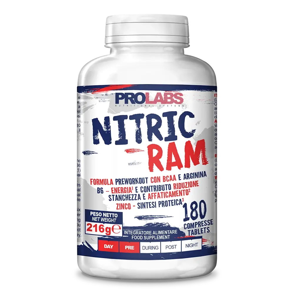 NITRIC RAM è un integratore alimentare di aminoacidi a catena ramificata e arginina ottenuti mediante fermentazione, arginina, vitamina B6 e zinco. I BCAA sono aminoacidi essenziali, l’organismo infatti non è in grado di sintetizzarli e devono pertanto essere assunti attraverso la dieta. Gli aminoacidi ramificati sono un fondamentale supporto muscolare per gli sportivi. Se assunti prima degli allenamenti hanno funzioni principalmente energetiche ed anticataboliche. Fungono da substrato energetico al fine di preservare la massa muscolare dal non essere disgregata a scopo energetico. Se assunti dopo gli allenamenti favoriscono la costruzione e il ripristino della massa magra. L’arginina supporta la produzione naturale di GH e di ossido nitrico da parte dell’organismo. L’ossido nitrico agisce da vasodilatatore vascolare, attraverso un aumento della disponibilità di ossigeno molecolare. La vitamina B6 contenuta in NITRIC RAM contribuisce al normale metabolismo energetico e a ridurre stanchezza e affaticamento. Inoltre supporta il normale metabolismo delle proteine e del glicogeno. La formula di NITRIC RAM è completata con zinco che contribuisce al mantenimento di normali livelli di testosterone nel sangue, contribuisce alla normale sintesi proteica e al normale metabolismo dei carboidrati. Non contiene ingredienti di origine animale, adatto anche ai vegani.