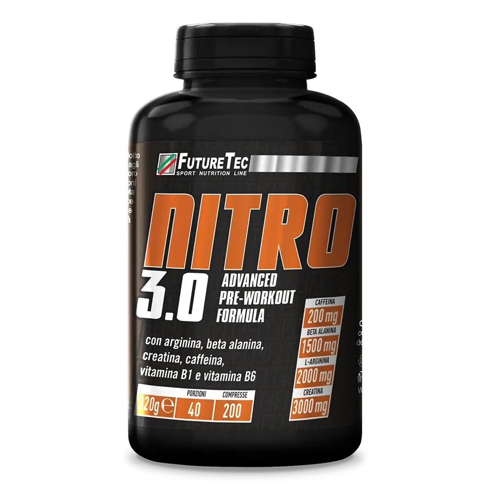 NITRO 3.0 è un integratore alimentare sviluppato per l’utilizzo prima dell’attività sportiva (pre workout). E’ indicato per gli sportivi adulti più esigenti che praticano sport di grande intensità e sforzo ed è realizzato con materie prime di elevata qualità. NITRO 3.0 fornisce purissima creatina monoidrato che favorisce l’aumento della potenza muscolare e della forza, quindi delle prestazioni fisiche, in caso di sforzi ripetitivi, di elevata intensità e di breve durata. L’arginina supporta la produzione naturale di GH e di ossido nitrico da parte dell’organismo. L’ossido nitrico agisce da vasodilatatore vascolare, attraverso un aumento della disponibilità di ossigeno molecolare. La Beta alanina viene convertita nell’organismo in carnosina, con funzione tampone sull’acido lattico e di controllo delle reazioni di glicazione. La caffeina aiuta a migliorare lo stato di allerta e la concentrazione. La vitamina B1 contribuisce al normale metabolismo energetico. La vitamina B6 contribuisce a ridurre la stanchezza e l’affaticamento. non contiene ingredienti di origine animale ed è adatto anche ai vegani.