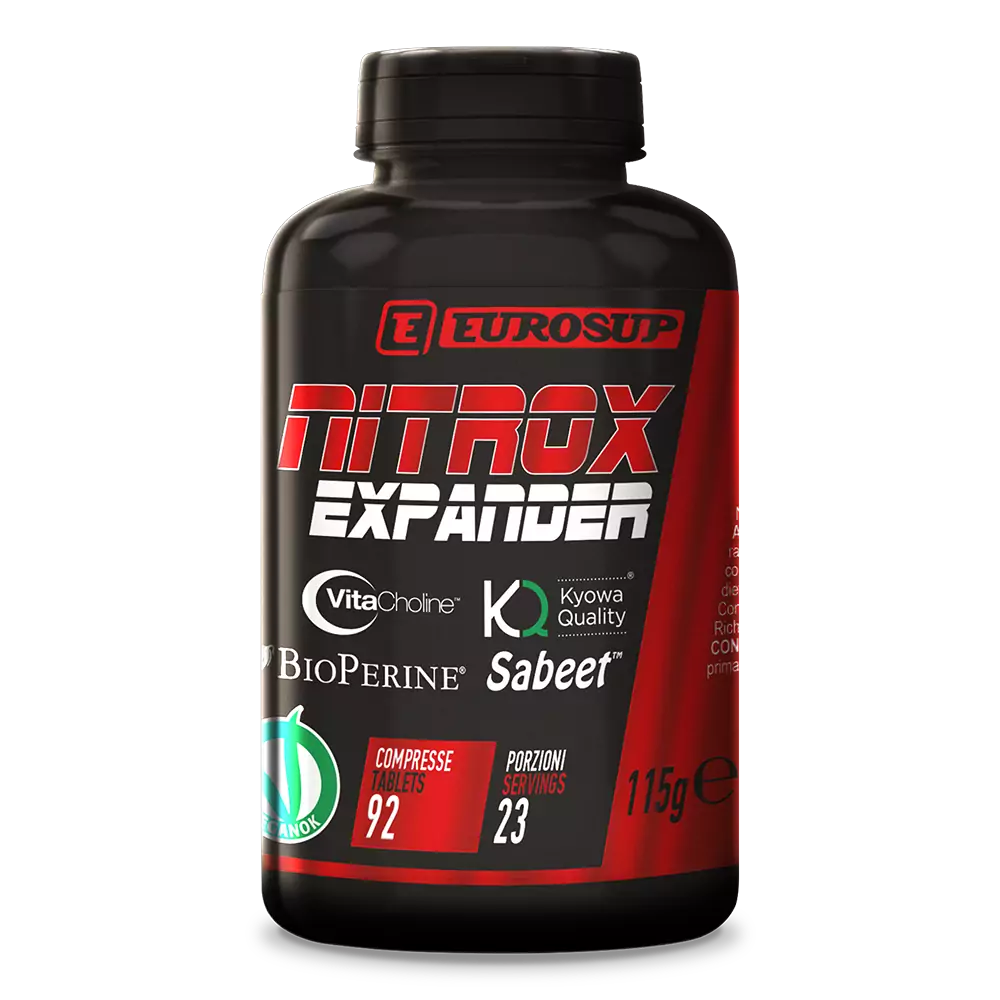NITROX EXPANDER è un integratore alimentare realizzato in compresse. Grazie a L-Arginina e L-Citrullina (Kyowa Quality®) supporta la produzione endogena di ossido nitrico, mentre l’estratto di barbietola Sabeet™ fornisce naturalmente nitrati, che sono utilizzati come ossido nitrico all’interno dell’organismo. La colina è un protettore dell’ossido nitrico: la molecola dell’ossido nitrico ha una durata limitata nel flusso sanguigno e poi deve essere sostituita. La colina ottimizza l’ossido nitrico, con vantaggi sulla sua presenza nel flusso sanguigno e contribuisce al normale metabolismo dell’omocisteina. L’ossido nitrico agisce da vasodilatatore vascolare, attraverso un aumento della disponibilità di ossigeno molecolare. L’estratto di semi d’uva favorisce la funzione vascolare, ideale in abbinamento con L-Arginina e L-Citrullina (Kyowa Quality®) e Sabeet™. L’estratto di semi d’uva contiene importanti micronutrienti e composti vegetali secondari, come gli OPC (proantocianidine oligomeriche) ed ha funzione antiossidante, quindi protegge le cellule del corpo dai radicali liberi. La piperina BioPerine® incrementa l’assimilazione dei nutrienti. La niacina, contribuisce al normale metabolismo energetico e alla riduzione della stanchezza e dell’affaticamento. NITROX EXPANDER non contiene ingredienti di origine animale ed è certificato VEGANOK.