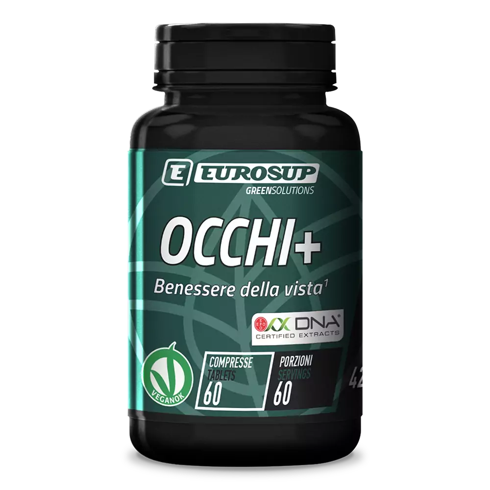 OCCHI+ è un integratore per la vista con estratti vegetali e vitamine A e B2, certificato VeganOK e garantito da analisi EPO DNA.