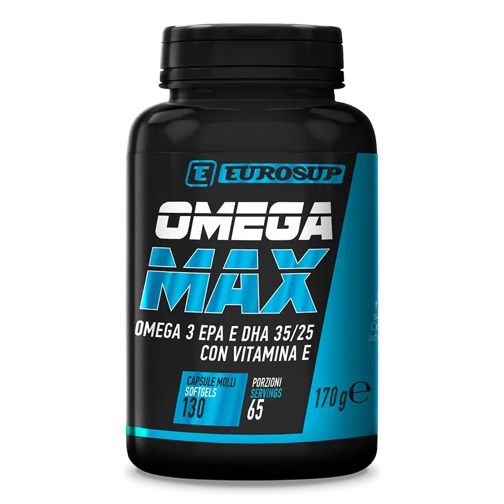 OMEGA MAX è un integratore alimentare di acidi grassi essenziali omega 3 EPA e DHA ad altissima concentrazione (60%), con l’aggiunta di vitamina E. Ogni capsula contiene 1000 mg di olio di pesce concentrato in 35% EPA e 25% DHA. Due capsule = una porzione del prodotto contribuiscono al mantenimento della normale funzione cardiaca (EPA e DHA) (’effetto benefico si ottiene con l’assunzione giornaliera di 250 mg di EPA e di DHA), della normale funzione cerebrale (DHA) e della normale funzione visiva (DHA)(l’effetto benefico si ottiene con l’assunzione giornaliera di 250 mg di DHA). La vitamina E contribuisce alla protezione delle cellule dallo stress ossidativo.
