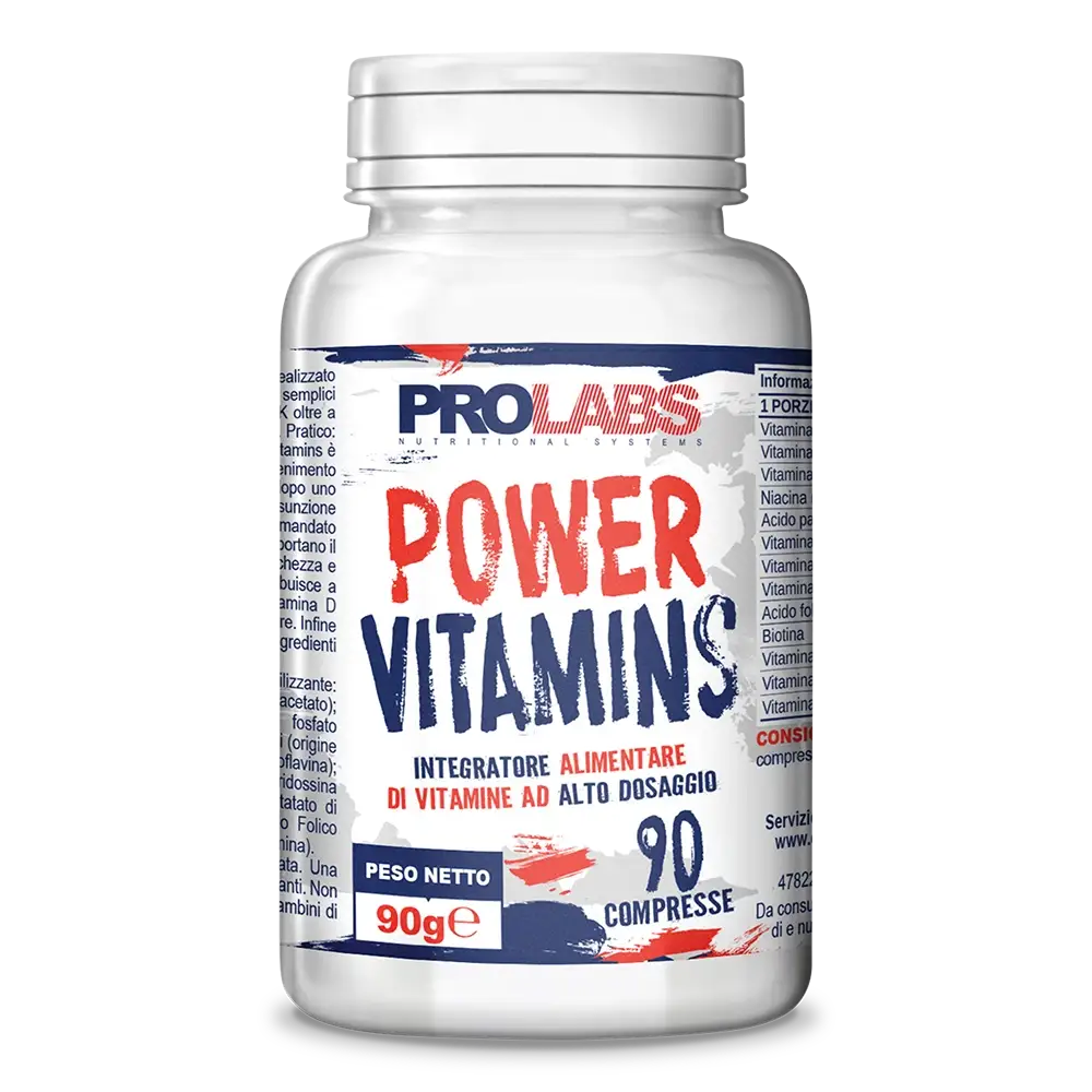 Power Vitamins è un integratore alimentare di vitamine realizzato da PROLABS. Il prodotto può essere descritto con tre semplici aggettivi. Completo: contiene tutte le vitamine (A,C, D, E e K oltre a quelle del gruppo B). Forte: le vitamine sono in alto dosaggio. Pratico: il tutto è racchiuso in compresse facili da deglutire. Le vitamine sono micronutrienti essenziali che l’organismo non è in grado di sintetizzare in quantità sufficiente, Power Vitamins è indicato anche per sportivi. La vitamina C contribuisce al mantenimento della normale funzione del sistema immunitario durante e dopo uno sforzo fisico intenso (l’effetto benefico si ottiene con l’assunzione giornaliera di 200 mg in aggiunta all’apporto giornaliero raccomandato di vitamina C). Le vitamine del gruppo B (B1, B2, niacina) supportano il normale metabolismo energetico e aiutano a ridurre la stanchezza e l’affaticamento (acido folico, B6, B12). La vitamina E contribuisce a proteggere le cellule dallo stress ossidativo mentre la vitamina D contribuisce al mantenimento della normale funzione muscolare. Infine la vitamina K al mantenimento di ossa sane. Non contiene ingredienti di origine animale. Con vitamina D3 di origine vegetale.