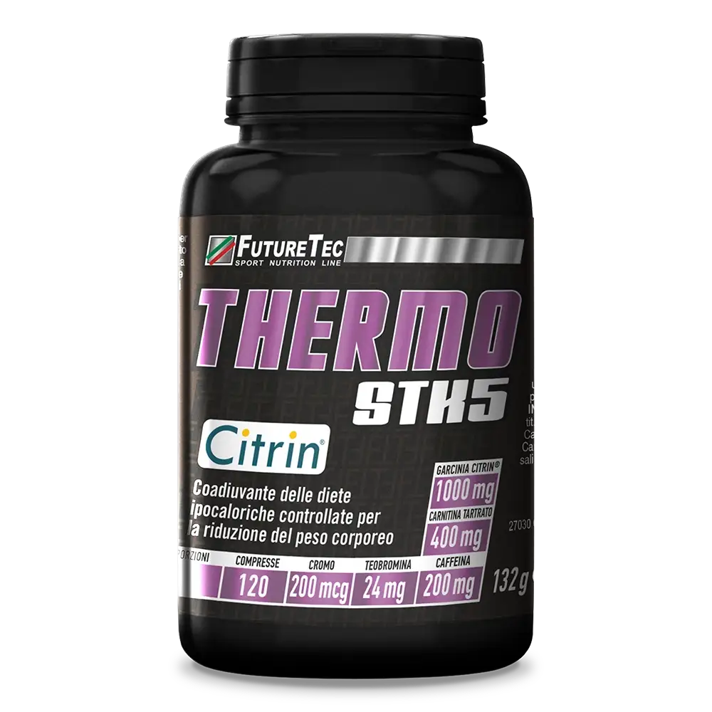 THERMO STK5 è un integratore alimentare coadiuvante delle diete ipocaloriche controllate per la riduzione del peso corporeo. Ogni porzione fornisce 1000 mg di Garcinia cambogia di qualità Citrin®. La caffeina ha azione termogenica e stimola il metabolismo. La carnitina è un nutriente che interviene nel trasporto di acidi grassi a lunga catena nella matrice mitocondriale, sede nella quale gli acidi grassi vengono convertiti in energia. Il cacao titolato in teobromina ha azione tonica e di sostegno metabolico. Il cromo contribuisce al normale metabolismo dei macronutrienti cioè carboidrati, grassi e proteine e al mantenimento di livelli normali di glucosio nel sangue. Non contiene ingredienti di origine animale, adatto anche ai vegani.