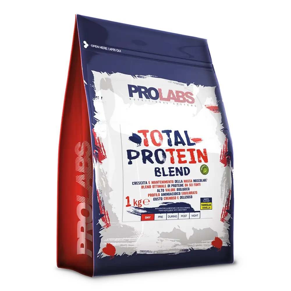 TOTAL PROTEIN è un integratore alimentare di proteine formulato con una combinazione di proteine a diverso tempo di assimilazione. Fornisce proteine di alta qualità e di alto valore biologico provenienti da sei fonti diverse: proteine totali del latte, proteine del siero di latte isolate, caseine micellari, proteine del siero di latte idrolizzate, proteine del siero di latte concentrate, proteine dell’albume d’uovo. Il blend proteico ha una composizione che garantisce un apporto aminoacidico equilibrato, inoltre le proteine contenute in TOTAL PROTEIN hanno tempi di digestione differenziati e rilasciano in modo graduale gli aminoacidi contenuti. Le proteine contribuiscono alla crescita e al mantenimento della massa muscolare. La vitamina B6 contenuta nel prodotto contribuisce al normale metabolismo delle proteine e del glicogeno e alla riduzione della stanchezza e dell’affaticamento. Con edulcoranti.